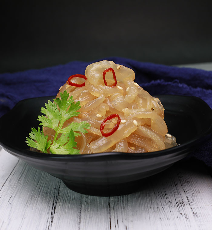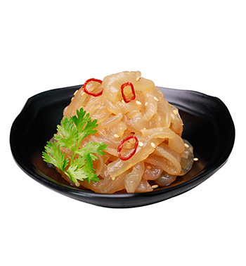 產品特點:精選優質海蜇,色澤清麗、晶瑩剔透,Q彈有嚼勁、清香酸甜好味道