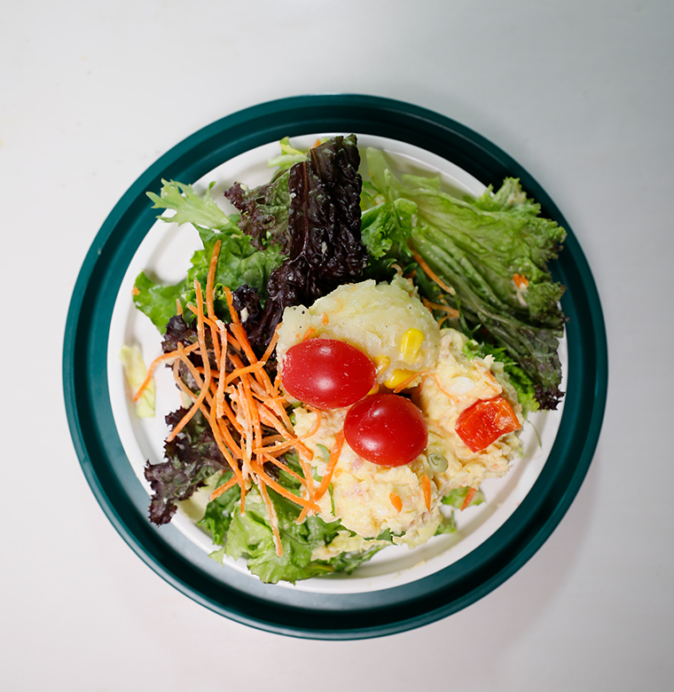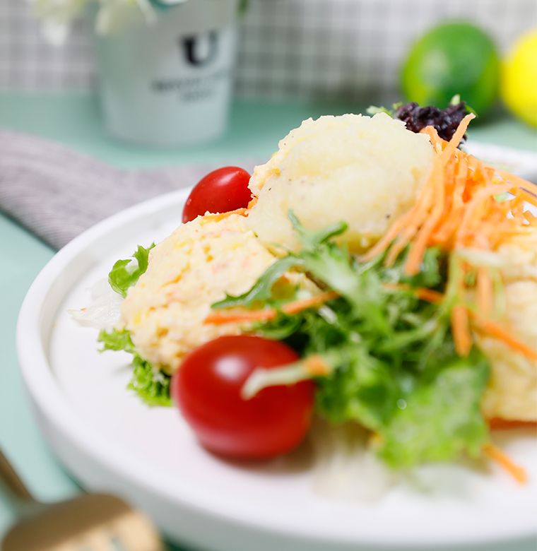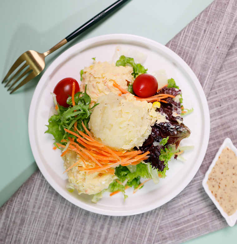 土豆、雞蛋、胡蘿卜、蛋黃醬、圣女果、西生菜、生菜、苦苣、玉米粒、紫葉生菜、三文治腸